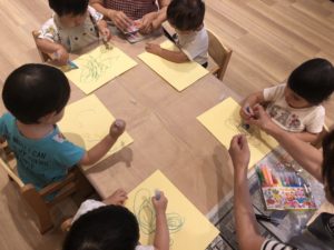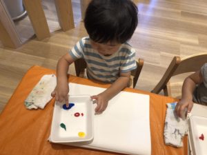 1歳児さんはサインペン、2歳児さんは絵の具です。