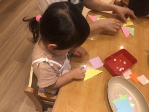 2歳児クラスのお友達はのりを使ってペタペタ…