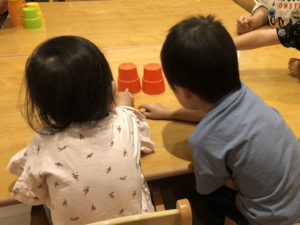 保育士がコップをシャッフルさせているのを